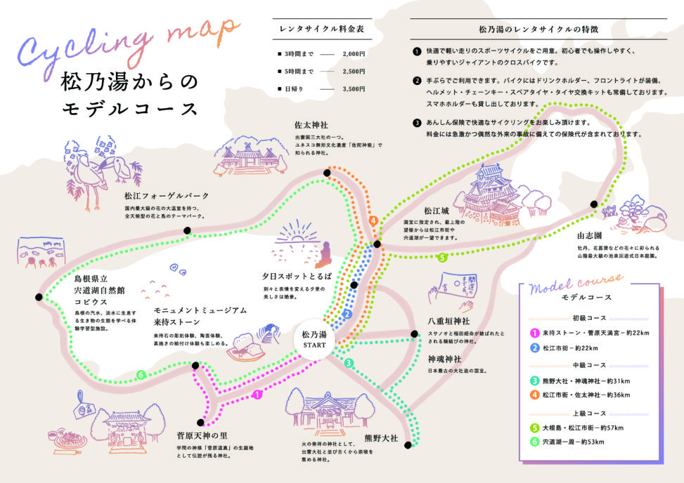【玉造温泉】松乃湯様 サイクリングマップ制作 旅館周辺をレンタサイクルで周遊する、 A4サイズのサイクリングマップを制作させていただきました。 制作 / イラスト、デザイン 投稿先 イラスト, イラストマップ, 紙のデザイン ← 過去の投稿へ 次の投稿へ →